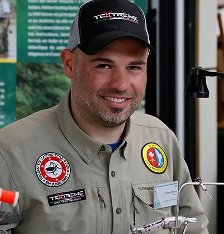 I have been fishing for as long as I can remember and have tried almost every form of angling, unDl in the mid-1990s I first saw a fly line dancing on the water. Almost immediately I began tying my own flies to take with me when fishing, and before long fly tying, alongside fishing itself, became my greatest passion. At the end of the 1990s I entered the world of compeDDons, remained acDve in it for many years, and achieved several placements. The most important was certainly winning the Italian Pair Championship in 2013, the same year in which, for various reasons, I also decided to stop compeDDve fishing. Since 2023 I have been a member of the Pro Team of the company Textreme. I am also a member, commiTee member and coordinator of fly-tying courses at the Club Pescatori a Mosca Ticino, and finally a board member of SIM Suisse.