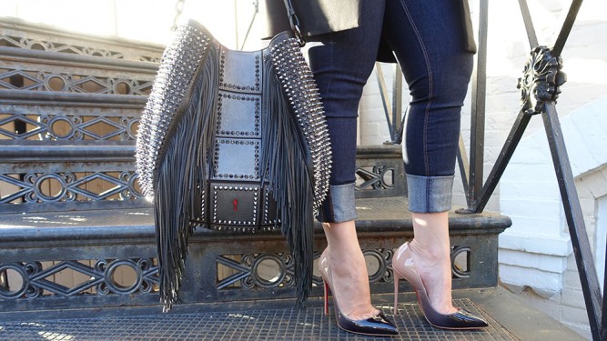 When I wrote about Louboutin’s fall collection early in the summer, I’ll admit, I had mixed feelings about the Lucky L Hobo. There’s an overwhelming amount of studding all over the bag, plus long fringe detailing on both the front and back. I’m happy I got my hands on it when I did, though, because my mixed feelings quickly changed to certainty.