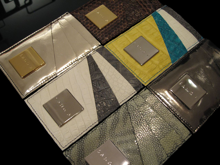 Top Left to Bottom Right: Rich Chocolate Shiny Python [$207], Four Tone Semi-Matte Crocodile [$220], Gunmetal Mirror Calf Leather [$138], White Gold Mirror Calf Leather [$138], Bone & White Semi-Matte Crocodile [$220], Grey Zebra Sanded Stingray [N/A]